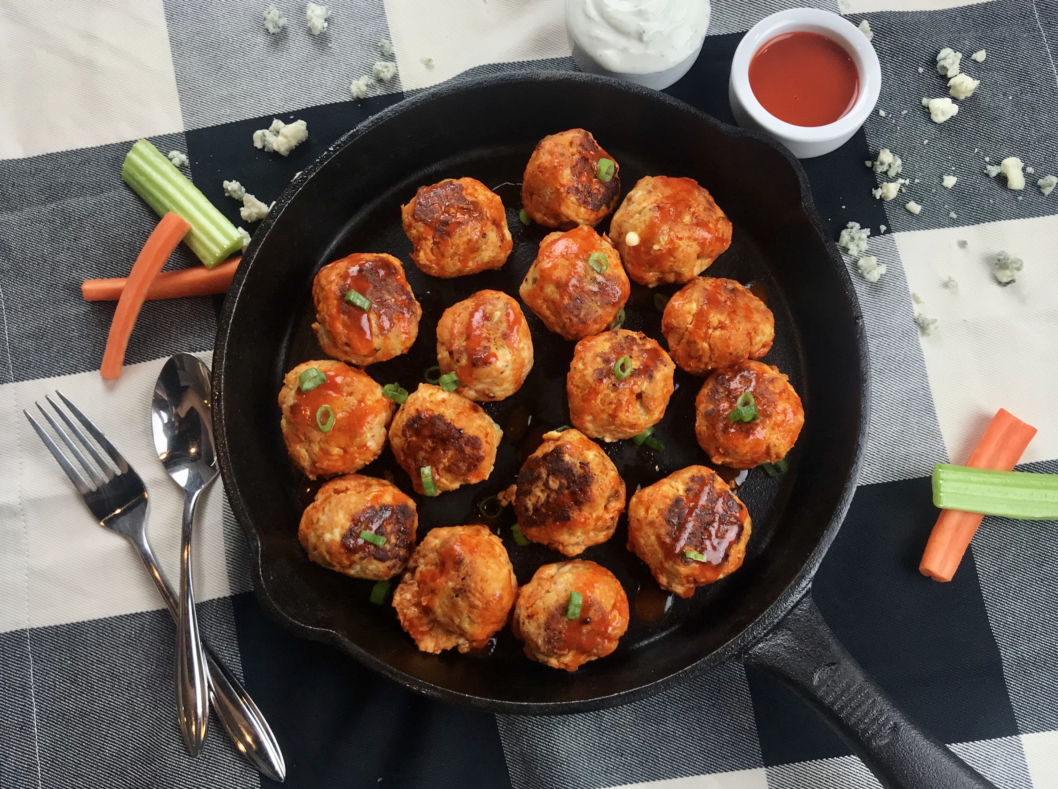 This is a go to healthy lunch prep for me! I’ve been making it for years and have had plenty of time to perfect this recipe. It’s easy to make and I’ve been able to flex it to accommodate the wideeeeeeeeeee variety of diets I’ve followed (Paleo, Keto, Whole30 to name a few). You can easily leave out the bread crumbs to lower the carb count or subtract the blue cheese if you’re avoiding dairy. The buffalo sauce is so flavorful it really makes this dish. I love to pair this with my healthy version of ranch dressing (Greek yogurt + ranch seasoning packet) but it goes great with regular ranch dressing as well. These meatballs are great for an appetizer (especially for football season!) and for a meal I like to serve with roasted sweet potato slices and garlic-y green beans.